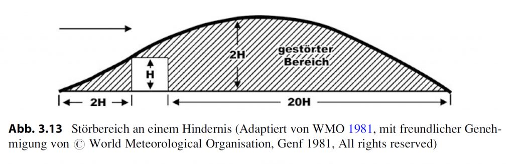 In einem Bild der World Meteorological Organisation, Genf 1981, das dort abgedruckt ist, erstreckt sich der Störbereich eines Hindernisses der Höhe H über die Länge 20H nach dem Hindernis. Hier wird also der doppelte Wert beschrieben, den das Staatsministerium in seiner 10 H-Regel festgelegt hat.
