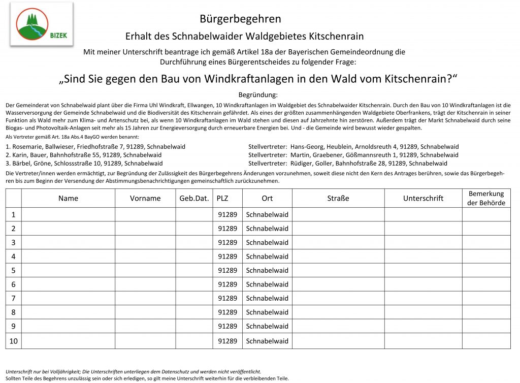 Mit dem Antrag auf Bürgerentscheid muss ein erfolgreiches Bürgerbegehren vorgelegt werden. Ein Bürgerbegehren besteht aus einer Unterschriftenliste, die bestimmte Eigenschaften erfüllen muss. Unterschreiben in Schnabelwaid 10 % der Wahlberechtigten Bürgerinnen und Bürger (77 Personen) die Forderung der BIZEK, ist das Bürgerbegehren erfolgreich.