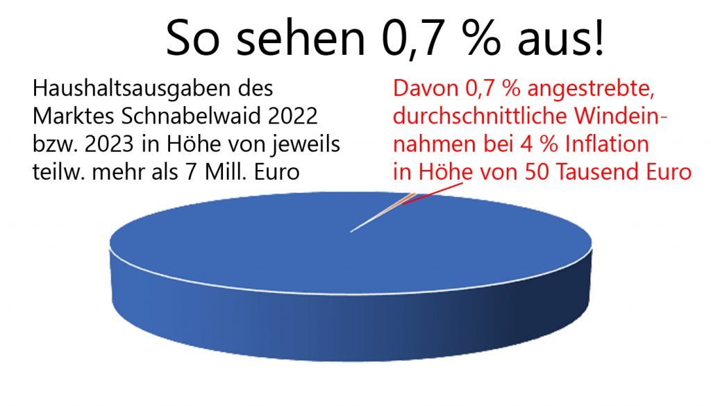 Die Bevölkerung stimmt darüber ab, ob es ein Projekt zulässt, das ihm nur Nachteile bringt. Natur, Wald, Wasser, Lebensqualität, Immobilienpreise usw. – alles wird durch die Windräder gefährdet. Einzig zählt ein Windpfennig, den ein Investor in Höhe von weniger als durchschnittlich 50 Tausend Euro pro Jahr (gerechnet bei 4 % Inflation) der Gemeinde verspricht. Der Haushalt der Gemeinde ist im Vergleich dazu aktuell 140 Mal so groß. Seit zwei Jahren beträgt er ca. 7 Millionen. Das Haushaltsvolumen hat von 2017 bis 2020 mehr als verdoppelt (Zunahme von 2.111.000 € auf 5.305.000 €, Zunahme um 151 %). Die Schulden haben sich im gleichen Zeitraum von 1.319.000 € auf 2.291.000 € um 74 % erhöht. 2020 gab es noch keine Inflation. Mit dem kostspieligen Bau des Kindergartens wurde erst 2021 begonnen. Die Bedeutung des Windpfennigs nimmt bei steigendem Haushaltsvolumen immer weiter ab. In der unteren Graphik erkennt man kaum noch die Relation.