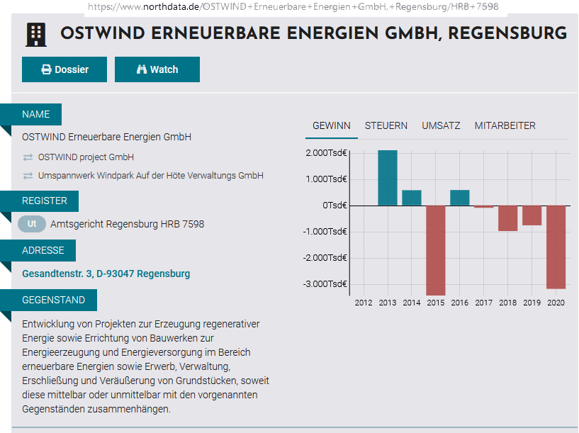Wie so etwas abläuft, zeigt die obige Graphik. Dort sind die Gewinne der Firma Ostwind in den Jahren 2012 bis 2020 eingezeichnet. Die Firma Ostwind hat 2016 den Windpark in Lindenhardter Forst in Betrieb genommen. Grob gerechnet erhält man die Gewerbesteuer, wenn man 3,5 % vom Gewinn mit dem Gemeindeschlüssel (z.B. 3,8) multipliziert. Jeder erkennt, dass in den letzten Jahren kein Gewinn und somit keine Gewerbesteuer angefallen ist.