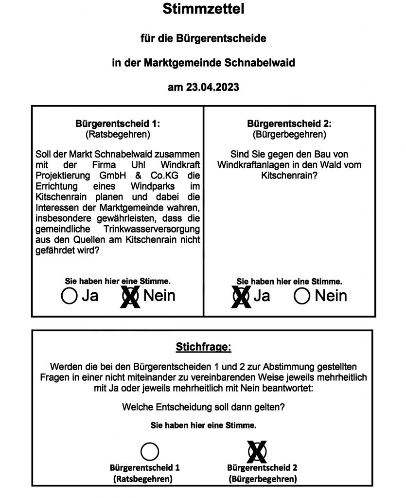 9. März 2023: Jetzt kommt Bewegung in die Sache und ein Bürgerbefragung wird im Gemeinderat beschlossen. Bis zu diesem Zeitpunkt, seit eineinhalb Jahre, wurde die Windkraft ohne Einbeziehung der Bürger und erst recht ohne Bürgerentscheidung konsequent vorangetrieben.
