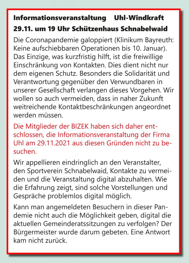Die Firma Uhl hat am 19.11.2021 im Ortsbereich von Schnabelwaid einen sechsseitigen Flyer verteilen lassen. In ihm werden einige Auswirkungen der geplanten Windräder auf unseren Wald im Kitschenrain und die angrenzenden Bewohner aufgeführt. Dieser Flyer ist ein PR-Produkt, das sich aus Bausteinen zusammensetzt, die zum großen Teil schon bei anderen Webekampagnen der Firma Uhl verwendet worden sind. Das Deckblatt zeigt ein Landschaftsbild, das mit der Umgebung von Schnabelwaid nicht vergleichbar ist. Bei den 35 Windrädern, die uns bereits umgeben, müsste man auf dem Bild mehr von ihnen erkennen. Auch auf die speziellen Verhältnisse von Schnabelwaid wird nicht eingegangen. Die Firma Uhl geht bei der Bewertung eines möglichen Schadens der Windräder auf unser Trinkwasser aus dem Kitschenrain von falschen Voraussetzungen aus. Sie spricht davon, dass kein Einfluss auf das Grundwasser erfolgt. Unsere Quelle wird aber nicht von Grundwasser, sondern von Oberflächenwasser gespeist, das auf Druck durch Fundamente wesentlich empfindlicher reagiert.